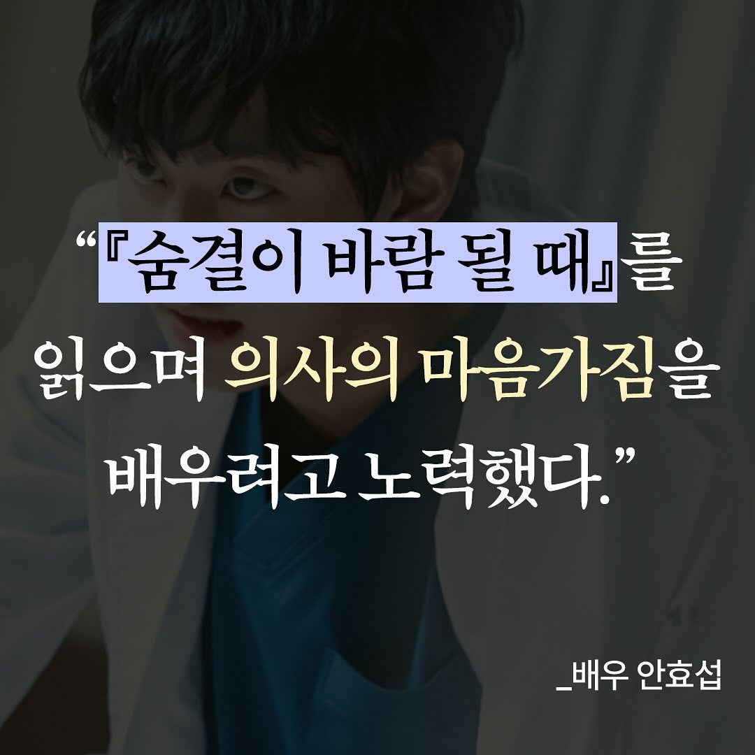 多くの読者の皆さんが人生の本として挙げてくださるのが、まさにこの本!『숨결이 바람 될 때(直訳:死が息を変えるとき)』をアン・ヒョソプ俳優さんも周囲に熱心に推薦しているという話を聞きましたㅠㅠㅠㅠ視聴者の皆さんから愛されまくったドラマ 『浪漫ドクター キム・サブ』を準備していた時も、 この本を何度も読んだそうです!