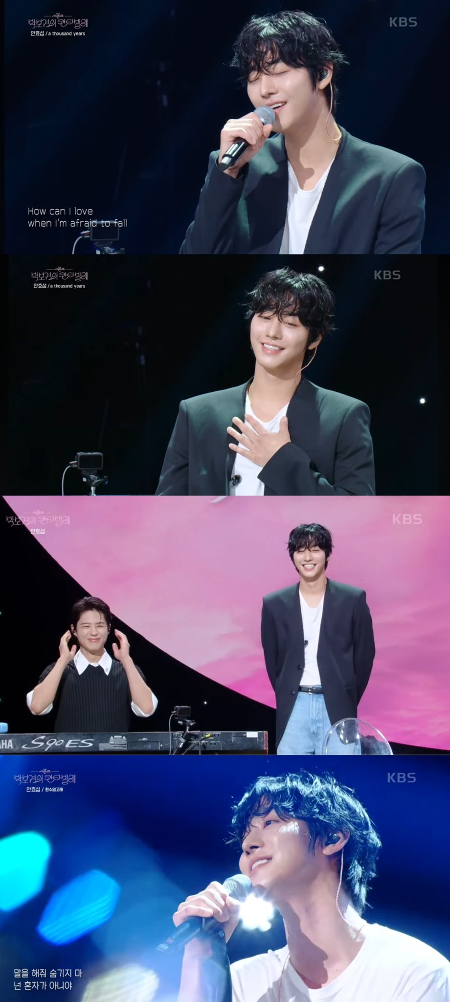 そんな中、彼は『A Thousand Years』『白ひげクジラ(흰수염고래)』、そしてパク・ボゴムとの共演で『僕の涙を集めて(내 눈물 모아)』『君を僕の胸に(그대 내 품에)』『感謝(감사)』のステージを通じて、甘く繊細な歌声で観客の心を深く揺さぶった。