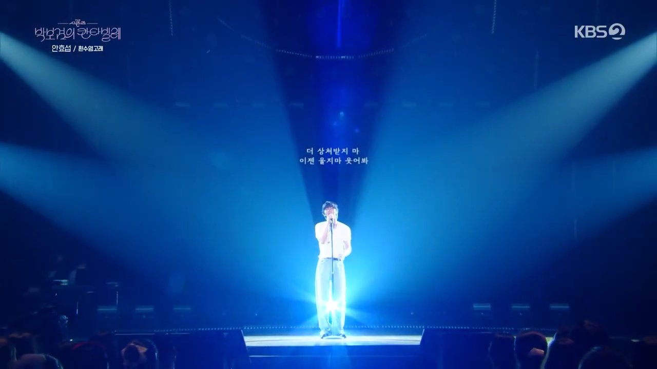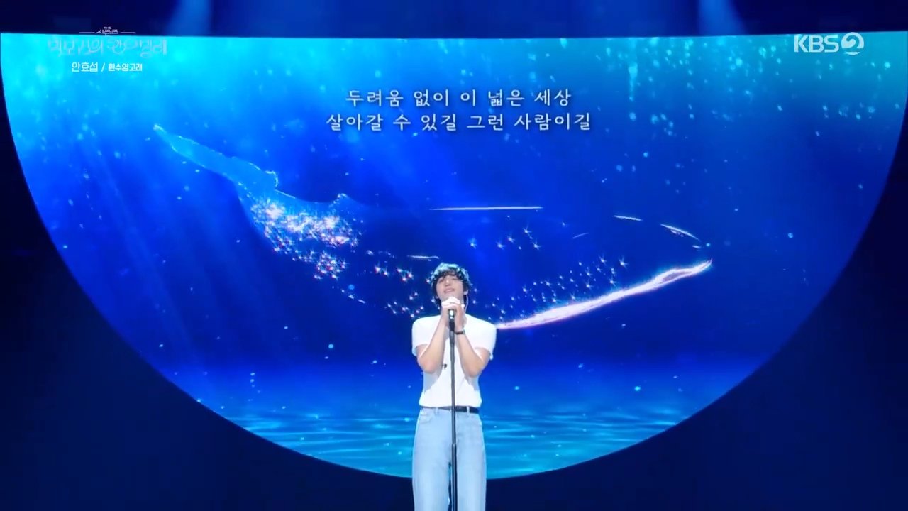 アン・ヒョソプは同番組を通じて初めて音楽番組に出演したが、この日歌った曲だけでなんと5曲に達する。クリスティーナ・ペリーの「A thousand years」を皮切りに、ソ・ジウォンの「私の涙を集めて」、ユ・ジェハの「あなた、私のもとに」、キム・ドンリュルの「感謝」まで歌った彼は、依然として緊張した様子でマイクを握った。最後の曲として、YBの「白ひげクジラ」を熱唱した。