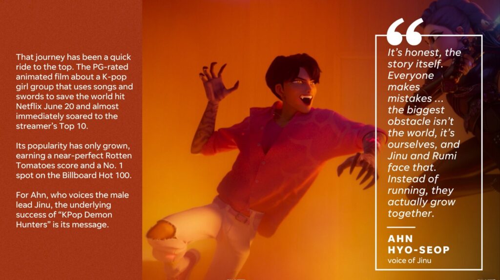 女性主人公ルミ(アーデン・チョー)と共演し、男性主人公ジヌの声を担当したアンヒョソプは、『K-Pop Demon Hunters』の成功の根底にあるのは“そのメッセージ”だと語る。