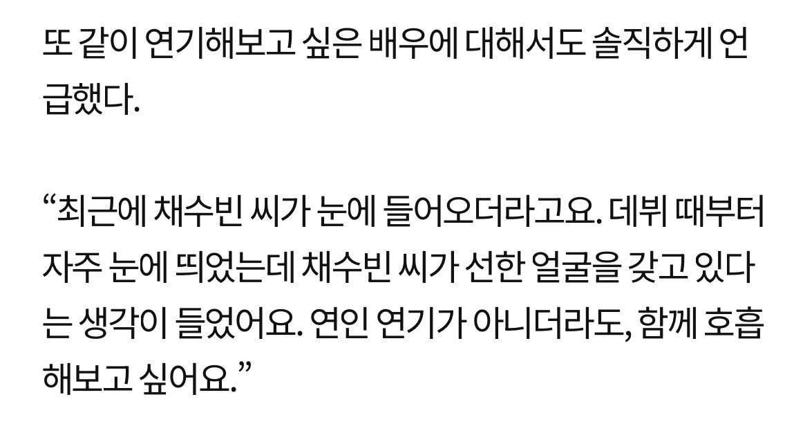 「最近、チェ・スビンさんが目に留まりました。デビュー当時からよく目に入っていたのですが、チェ・スビンさんは優しい雰囲気の顔をしているなと思いました。恋人役でなくても、一緒に演じてみたいです。」
